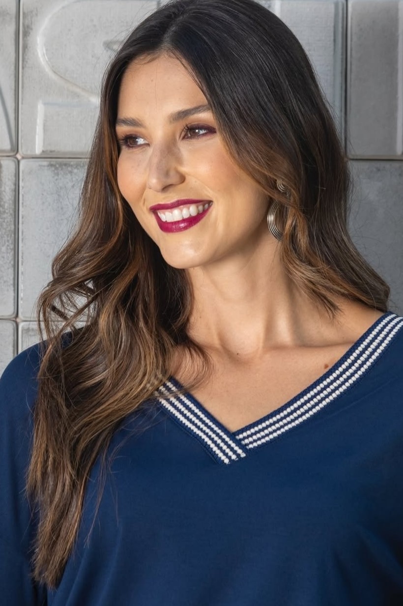 A blusa com decote em V que combina com tudo — elegante, confortável e feita pra te acompanhar em qualquer momento.